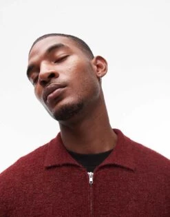 Topman Textured Zip Through Collared Cardigan In Red For Men Burgundy