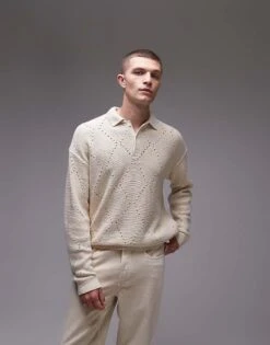 Topman Oversized Diamond Pointelle Knitted Polo In Cream For Men Ecru