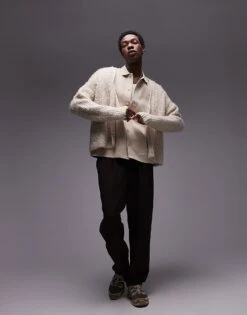 Topman Linen Mix Funnel Neck Full Zip Through In Ecru For Men