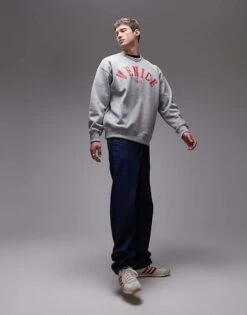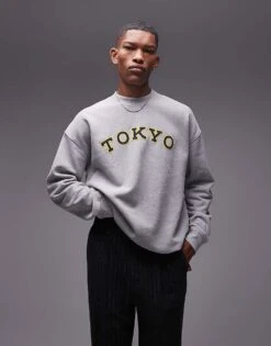 Topman Oversized Fit Sweatshirt With Tokyo Applique Embroidery In Grey Marl For Men