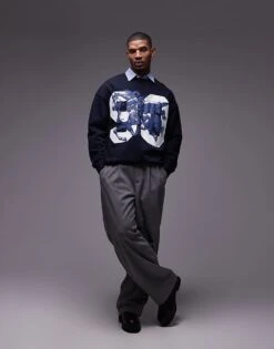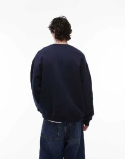 Topman Oversized Fit Sweatshirt With Front And Back Tulip Chenille Embroidery In Navy For Men