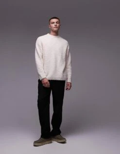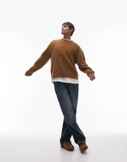 Topman Premium Relaxed Fit Lambswool Open Collar Jumper In Khaki For Men