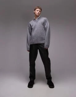 Topman Premium Relaxed Fit Lambswool Open Collar Jumper In Grey For Men