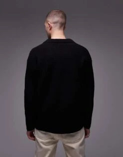 Topman Premium Relaxed Fit Lambswool Open Collar Jumper In Black For Men