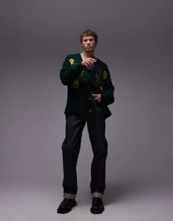 Topman Relaxed Cardigan In Green With Floral Jacquard Pattern For Men