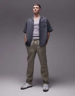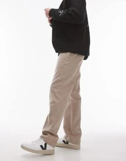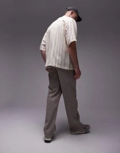 Topman Straight Linen Blend Textured Trousers In Stone For Men