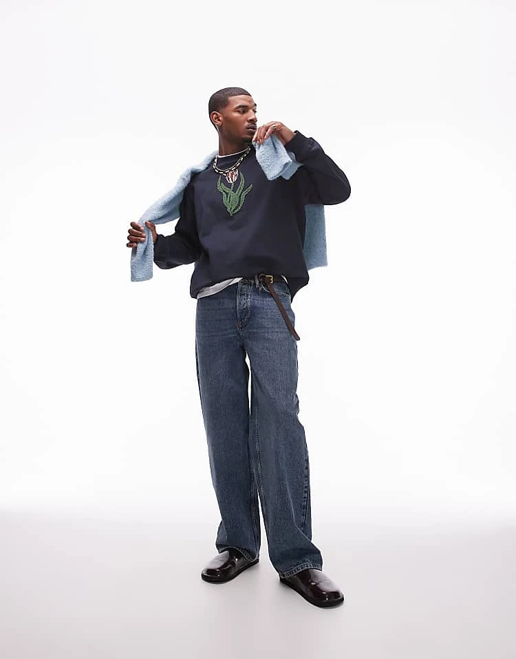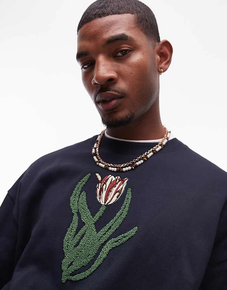 Topman Oversized Fit Sweatshirt With Front And Back Tulip Chenille Embroidery In Navy For Men